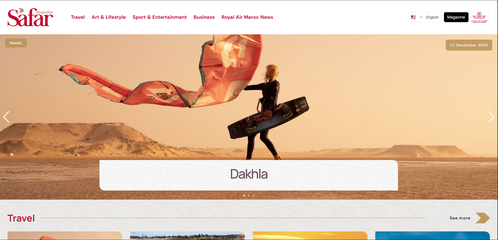 Online magazine covering articles on travel, art & lifestyle, sports, business, and even a section labeled "Royal Air Maroc News." From the homepage, you can see various articles about destinations like Dakhla and cultural stories along with sport and business content.